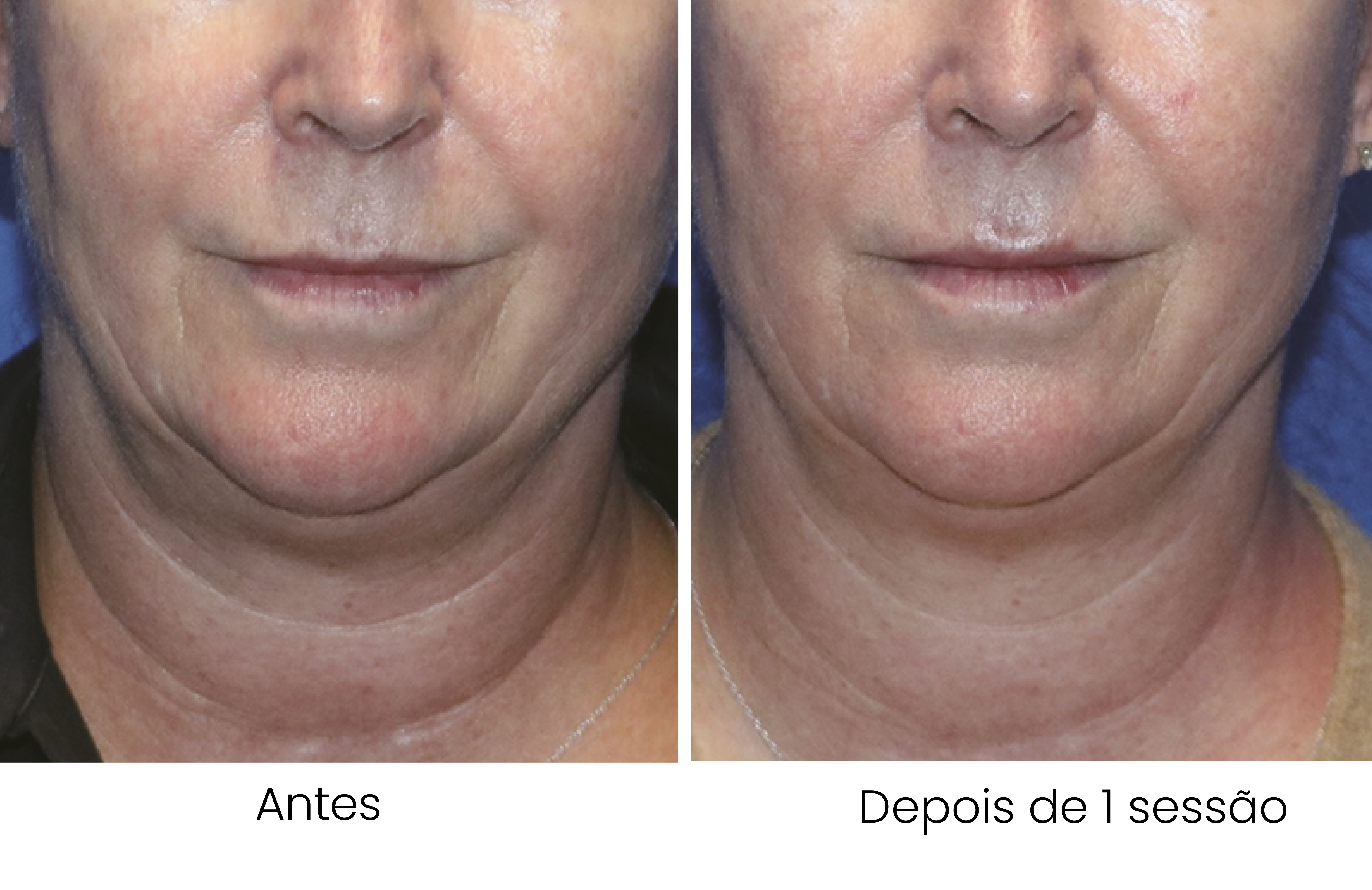 RF monopolar (duradouro): aquecimento volumétrico em derme profunda, gordura, septos fibrosos e fáscia; fortalecimento de ligamentos de retenção; definição de linha mandibular; evolução 4–6 meses com duração até 12 meses*.